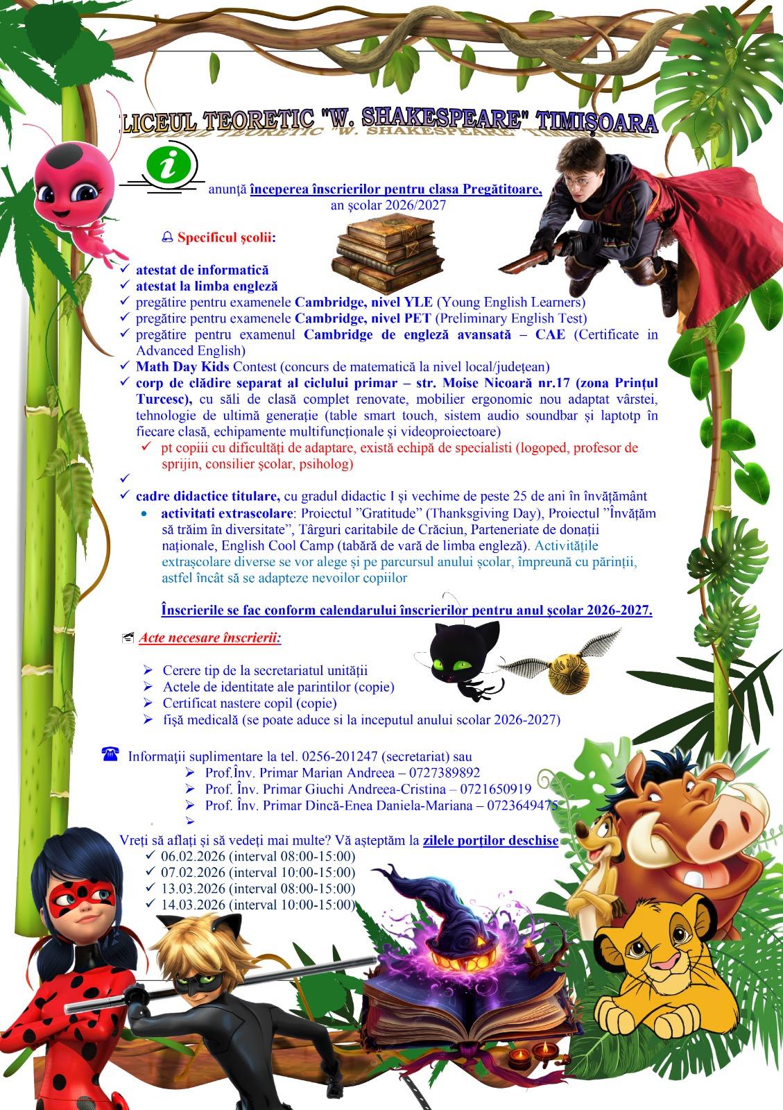 L.T. William Shakespeare 300092, TIMISOARA, str. I.L.CARAGIALE, nr. 6e-mail: secretariat@williamshakespeare.ro tel: +40 356 406 990 Secretariat +40 256 201 247 Informatizare fax: +40 256 435 188 Orar secretariat
